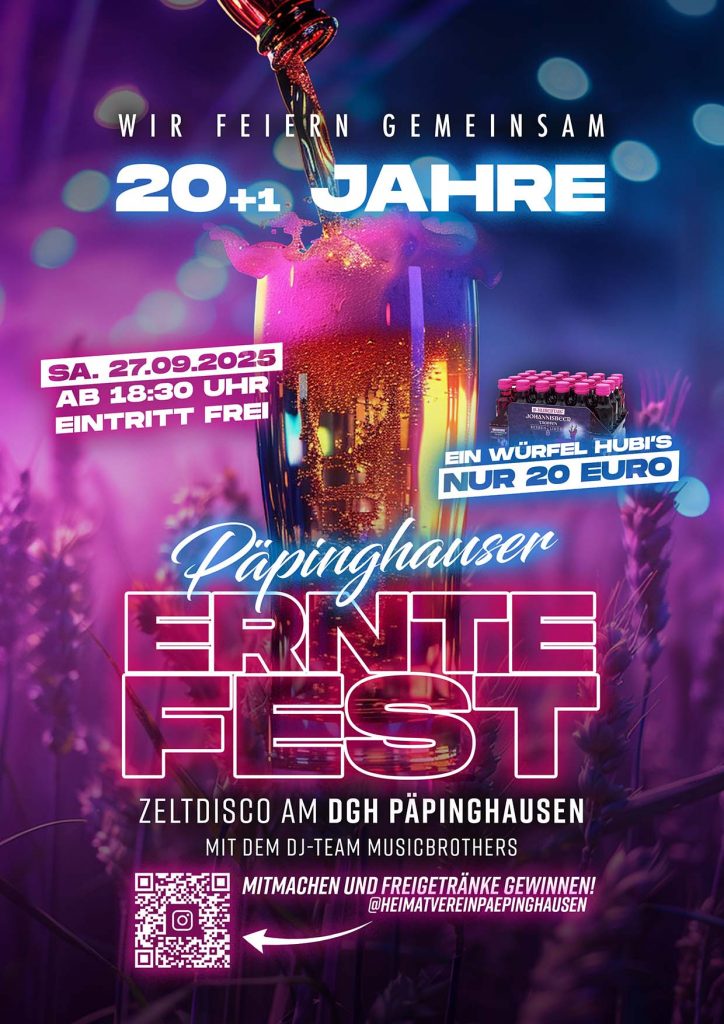 Zum Abschluss des Tages startet um 18:30 Uhr die große Erntedisco im Festzelt. Das DJ-Team Musicbrothers begleitet uns beim Erntefest Päpinghausen mit bester Musik und sorgt für ausgelassene Stimmung bis spät in die Nacht.